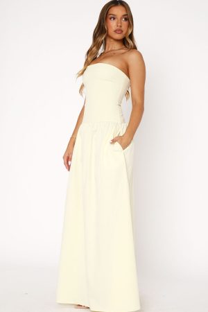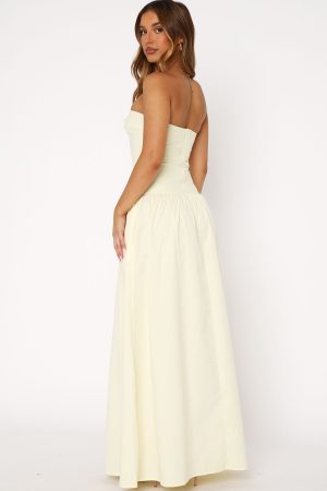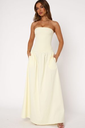 Elegant and chic. The Take Back Maxi Dress Lemon features a strapless design with gel grip on bust. invisible centre back zipper and closure. fitted bodice design. and gathered skirt detailing. Style with pointed toe heels and gold accessories for an old-money look!