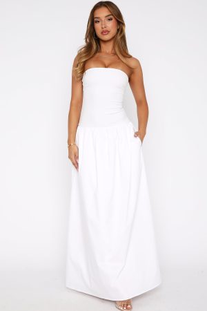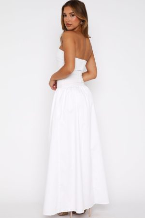Elegant and chic. The Take Back Maxi Dress White features a strapless design with gel grip on bust. invisible centre back zipper and closure. fitted bodice design. and gathered skirt detailing. Style with pointed toe heels and gold accessories for an old-money look!