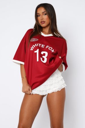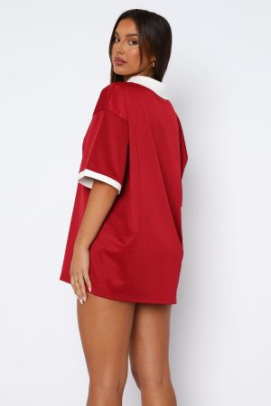 The jersey for that all day kind of cool! The Take The Chance Oversized Jersey Cherry features a v-neckline. collared detail. oversized fit. lightweight and lined fabric. Pair with booty shorts and shades for a sporty and chic vibe!