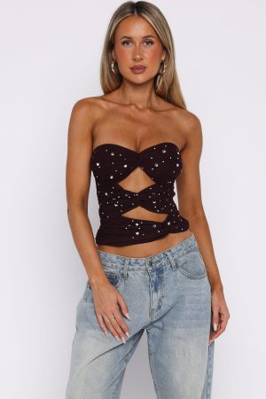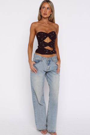 The Taking What’s Mine Strapless Top in Plum all about the details. Features strapless neckline. grip tape. ruched knotted fabrication centre front with cut outs and stunning pearl and crystal detailing. Style with your go-to denim jeans. heels and layered gold jewellery for all eyes on you.