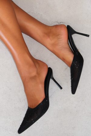 Get your glam on with the Tammy Mules Black Diamante! Featuring a pointed toe. open. rounded back and diamanté embellishments. Pair with a bustier and high shine accessories for a chic ensemble!