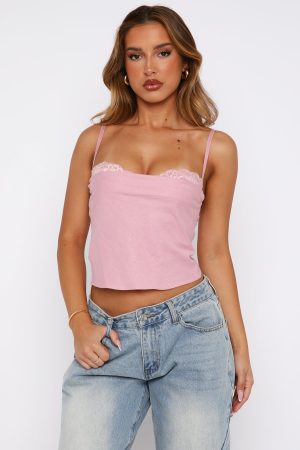 Add a subtle touch of luxe to your outfit in the Tell Me All About It Top Pink. Features a sewn in lace bra with thin adjustable straps and adjustable back closure. lightweight linen fabric. tie-up back detail and layered bra effect. Looks best paired with a low rise jean and mini bag for a dainty look!