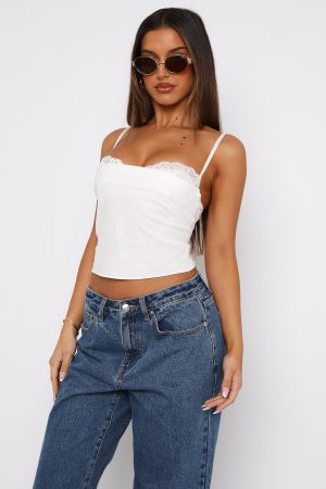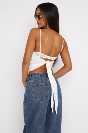 Add a subtle touch of luxe to your outfit in the Tell Me All About It Top White. Features a sewn in lace bra with thin adjustable straps and adjustable back closure. lightweight linen fabric. tie-up back detail and layered bra effect. Looks best paired with a low rise jean and mini bag for a dainty look!