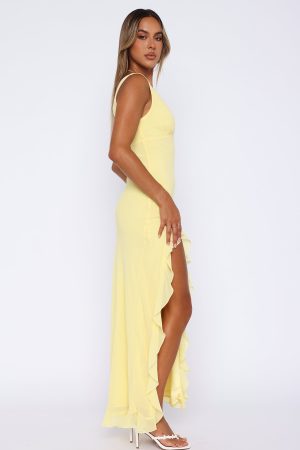 You don’t want to stay in tonight with the Tell Me Everything Maxi Dress Lemon! Features a plunge neckline. thick straps. frill drop hem. invisible zipper on the side and lined fabric. Complete the look with clear heels and gold accessories for a look that is sure to turn heads!