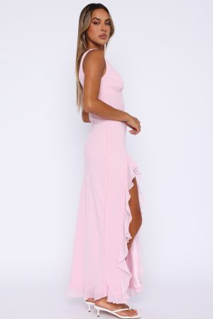 You don’t want to stay in tonight with the Tell Me Everything Maxi Dress Pink! Features a plunge neckline. thick straps. frill drop hem. invisible zipper on the side and lined fabric. Complete the look with clear heels and gold accessories for a look that is sure to turn heads!