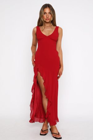 You don’t want to stay in tonight with the Tell Me Everything Maxi Dress Wine! Features a plunge neckline. thick straps. frill drop hem. invisible zipper on the side and lined fabric. Complete the look with clear heels and gold accessories for a look that is sure to turn heads!