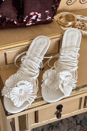 Consider this your sign to dress up. these heels are ready to flirt! The Tempest Wrap Heels Off White feature a wrap around ankle strap. square stiletto heel. open pointed toe design. and flower embellishments for a romantic touch.