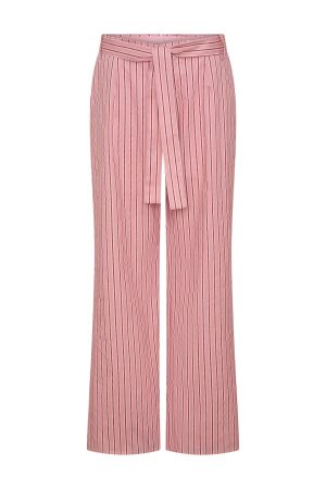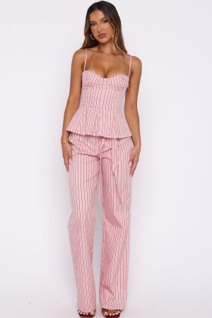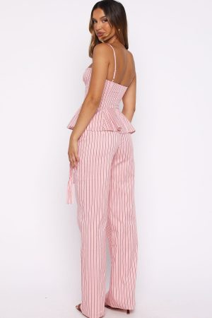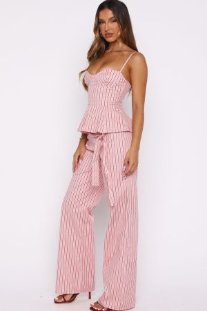 The Tempt Me Not Pants Pink Stripe is made for sunrise-to-sundown styling. These pants feature a fixed waistband with hook-and-bar. zipper. and button closure. complemented by belt loops and a detachable fabric belt for added versatility. Finished with functional side pockets. a wide-leg silhouette and fully lined. Style with the matching Tempt Me Not Top and kitten heels for a look we love.