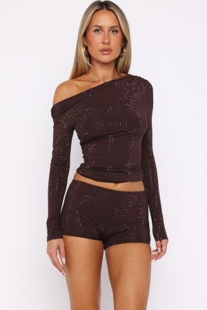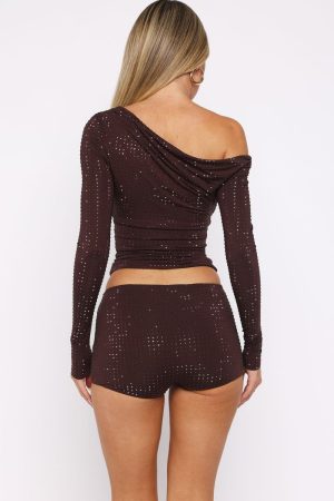 Girls just wanna have fun! The Tempted Heart Embellished Mini Shorts in Chocolate feature a thin elastic waistband. a booty-skimming length. fully lined for comfort and high-stretch fabrication. decorated with sparkling diamanté embellishments. Style them with the matching Tempted Heart Embellished Top and your favourite heels for a look we love.
