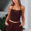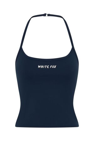Lounge lovers are obsessed with the Test Drive Halter Top Navy. Designed with fixed adjustable halter straps. a scoop neckline and a fitted bodice crafted in high-stretch fabrication. this sleek piece showcases a puff-print metallic White Fox text across the centre front. Style with the matching Test Drive Lounge Shorts for a cozy yet cool fit.