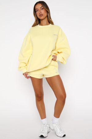 Lounge lovers are obsessed with the Test Drive Oversized Sweater Lemon! Designed with ribbed crew neckline. and ribbed hems which round out an oversized silhouette. Featuring long sleeves. and an unlined fleece interior. this sweater delivers a cozy feel. Finished with puff print metallic White Fox text side front. Completed the look with the matching Test Drive Lounge Shorts for a cosy yet cool look.