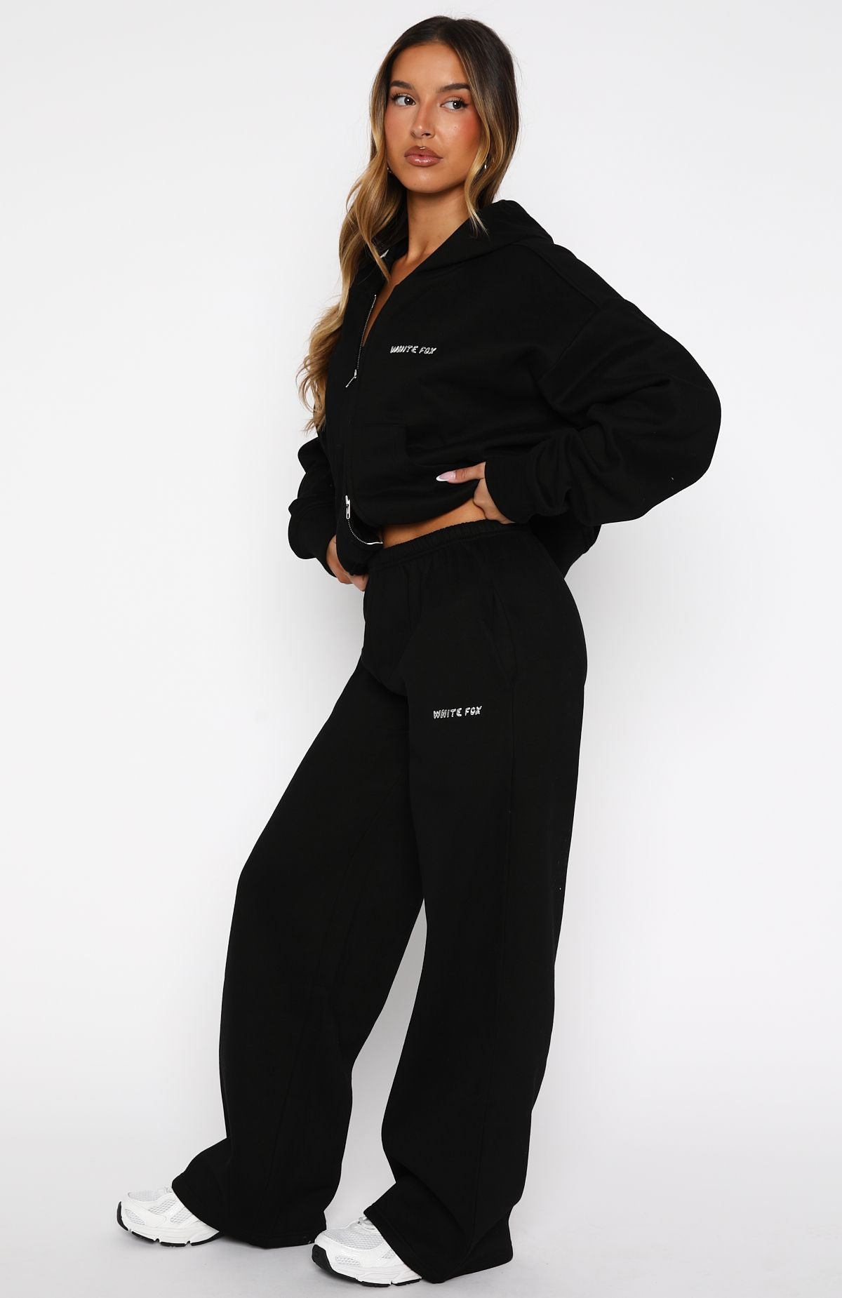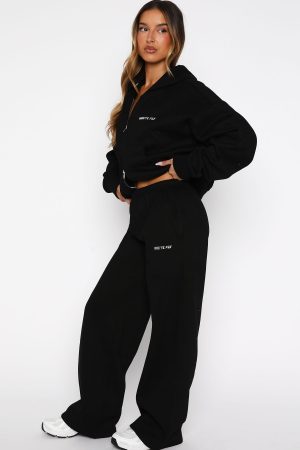 Lounge lovers are obsessed with the Test Drive Wide Leg Sweatpants in Black! Designed with a thick elasticated waistband featuring an internal drawstring tie. side pockets. and a wide-leg silhouette. The White Fox puff-print metallic text at the side adds a signature touch. while the unlined fleece interior ensures a cozy feel. Style with the matching Test Drive Oversized Sweater for a cozy yet cool fit.