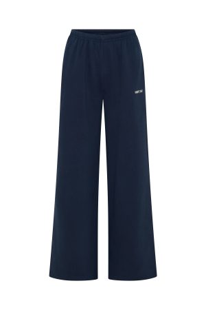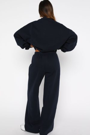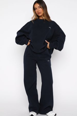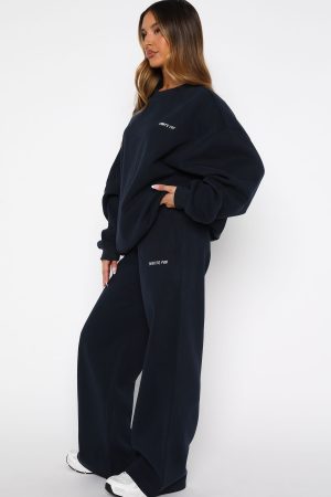 Lounge lovers are obsessed with the Test Drive Wide Leg Sweatpants in Dark Navy! Designed with a thick elasticated waistband featuring an internal drawstring tie. side pockets. and a wide-leg silhouette. The White Fox puff-print metallic text at the side adds a signature touch. while the unlined fleece interior ensures a cozy feel. Style with the matching Test Drive Oversized Sweater for a cozy yet cool fit.