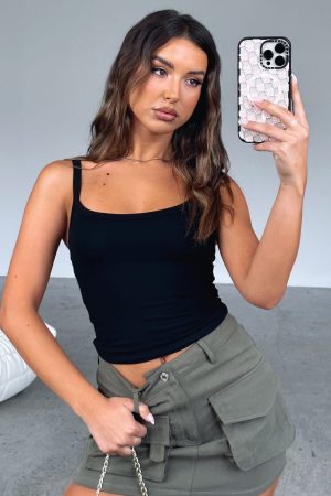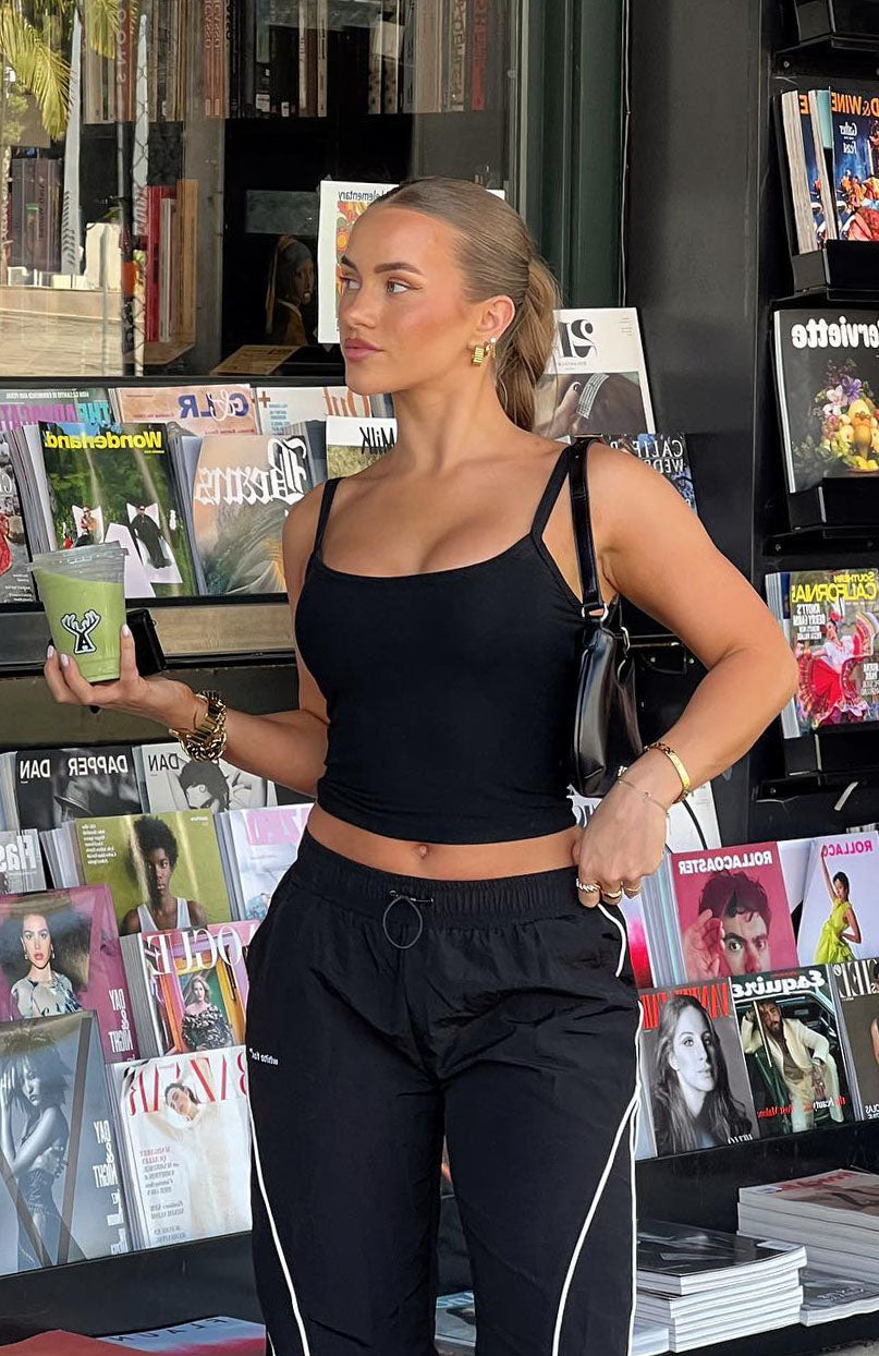 The Best Asset Tank in Black is the perfect addition to your capsule wardrobe. Featuring thin straps. cropped length. stretch jersey fabric. You can style this tank multiple different ways. We love with low rise denim and slides for an off-duty model look.