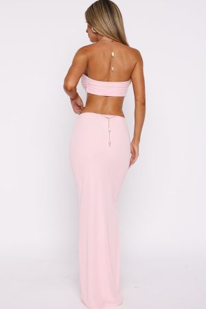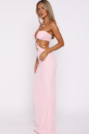 Channel your inner goddess in the Empress Maxi Dress in Baby Pink! This maxi length silhouette features a chain halter neckline adorned with chunky beadwork which can be worn straight or crossed at the front. Designed with integrated grip tape at bust for support. and purposeful cut-out at the waist framed with coordinating chains and beads. Crafted from a high‑stretch. lined fabric. it’s elegantly backless while ensuring comfort and hold where it matters. Finish the look by making those stilettos speak and let your layered jewels do the talking.
