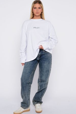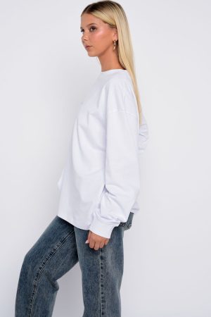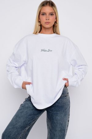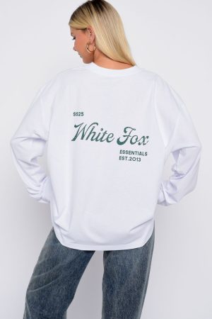 Chilled classics! The Good Life Back Long Sleeve Tee in White refreshes a laid-back classic with its cozy crew neckline. subtly slouched shoulders. and long sleeves with ribbed cuffs. The oversized silhouette makes a statement. while the cursive White Fox text printed on both front and back adds a touch of bold charm. Pair with your fav denim jeans. sneakers and a shoulder bag for the perfect chill weekend fit.
