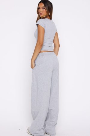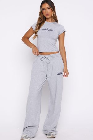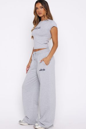 The Original Track Pants Grey Marle are designed for easy days. Featuring an elasticated waistband with drawstring. wide leg design. side pockets and unlined material. finished with a logo embellishment on the front side leg. Pair with the The Original Baby Tee for the cutest lounge look ever!