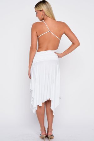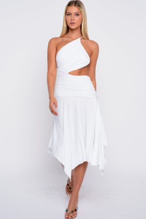 She’s a total midi must! Meet the Tie Me Down One Shoulder Midi Dress in White. designed with a chic one-shoulder neckline. adjustable back strap. and daring backless cut. Featuring a waist cut-out. ruched hip detailing. asymmetric midi hem. and front thigh split. this high-stretch dress is made to flatter every curve. Style with kitten heels and layered gold jewellery for a look we love.