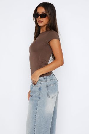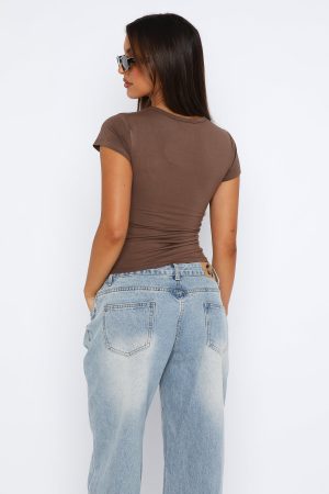 The Ultimate Cool Girl Basic the Too Blessed Tee in Mocha. This tee is fitted with short sleeves and a soft jersey fabric. We love paired with leather pants and stand out accessories. or for a more casual look just add sweats!