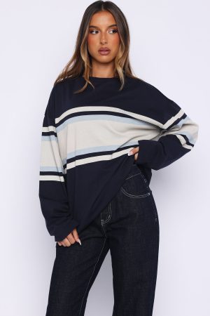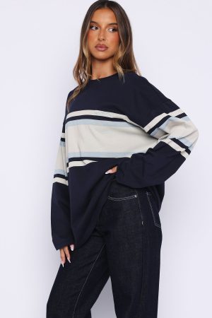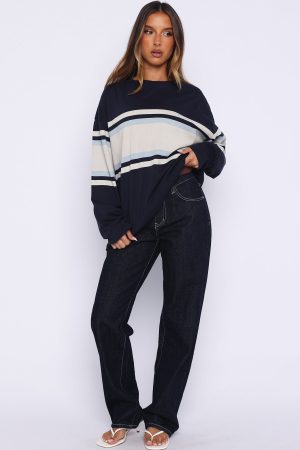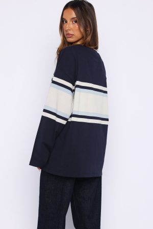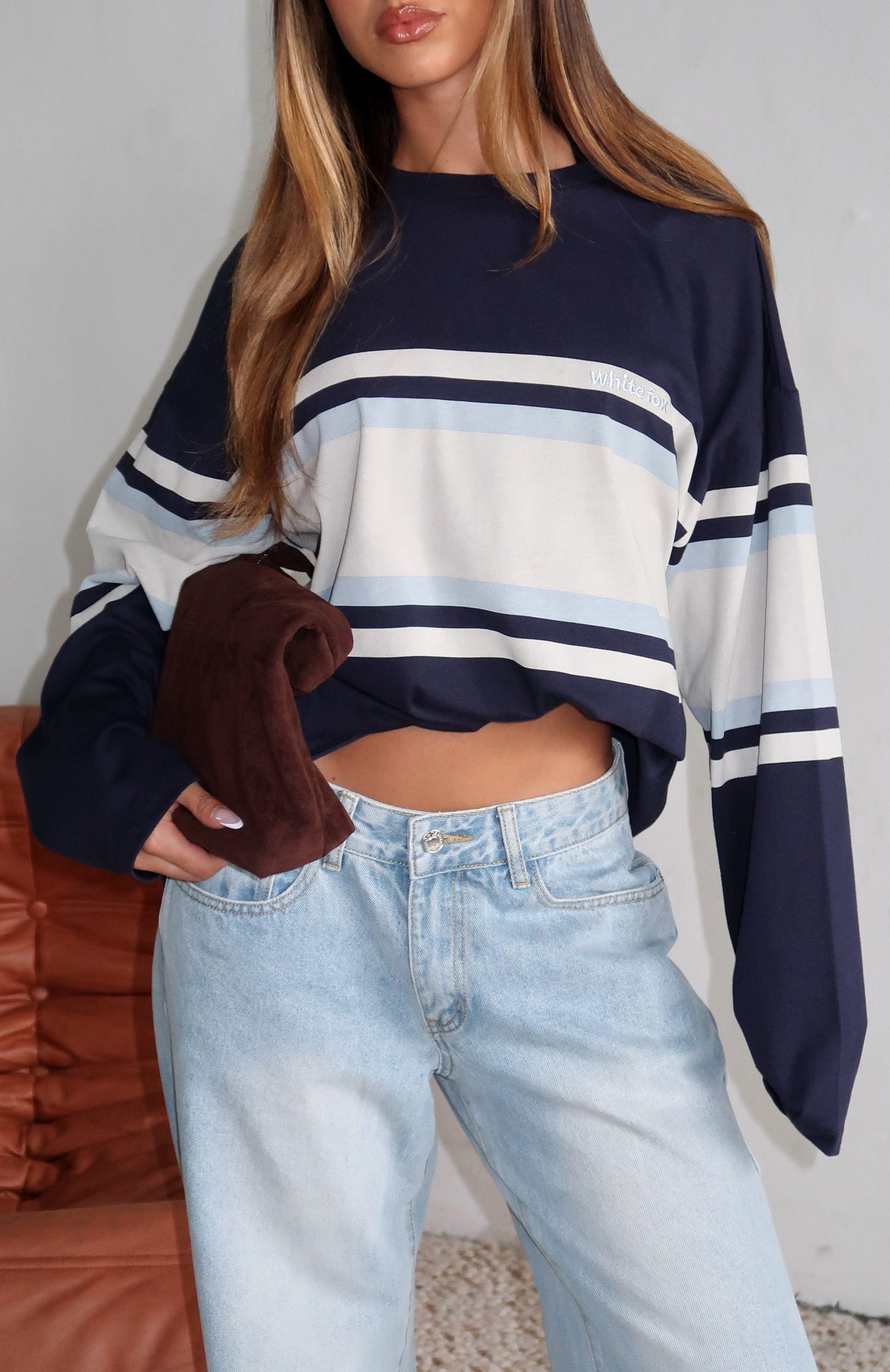 Chill weekend vibes call for the Too Cool For You Oversized Long Sleeve Tee Navy. Features a classic crew neckline. long sleeves. and bold stripe detailing across the bust and sleeves. complemented by embroidered White Fox text at the side front. Made from high‑stretch. unlined fabrication in an oversized fit. Style with denim jeans. sneakers and sunnies for an effortlessly cool. laid‑back look.