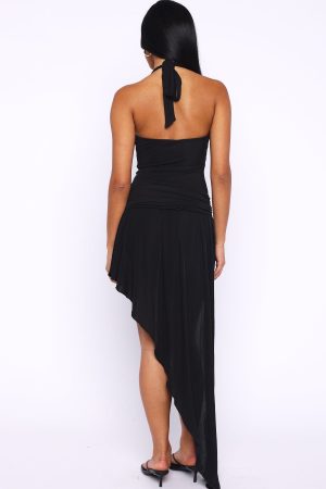 Meet your new LBD powerhouse. The Too Sweet To Stay Midi Dress in Black pairs bold halter straps and a sculpted plunge neckline with a thick. silver-buckled belt for a sultry. defined waist. An asymmetrical hemline and open back add drama. while the fully lined. high-stretch fabric hugs your curves. Style it with kitten heels and layered gold jewellery to nail that flirty. night-out vibe.