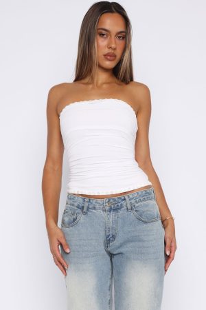 The Took A Look Strapless Top White features a strapless design with gel grip at bust. figure-hugging fit. full length. beaded detailing at hem and stretch material for an easy slip on design. Pair with low rise jeans for a look we love!