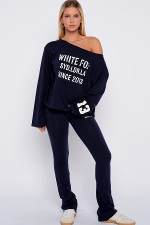 Comfy just got cool. The Topic of Discussion Flare Pants in Navy feature a thick waistband. sleek flared leg. and a crisp White Fox logo along the front for signature style. Crafted from high-stretch fabric and unlined for easy wear. they’re effortlessly chic when paired with the matching Topic Of Discussion Off Shoulder Oversized Long Sleeve Tee Navy.