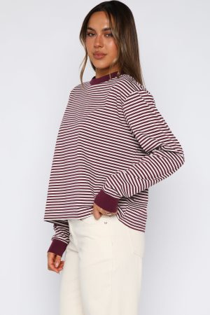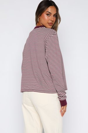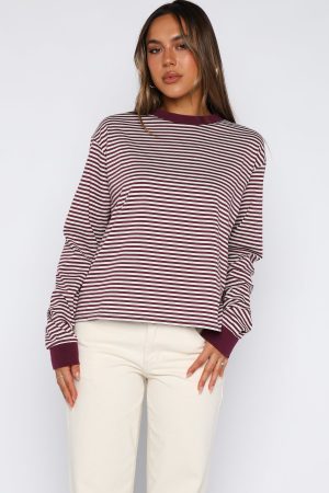 Instantly polished in stripes. The Touchdown Long Sleeve Tee in Plum Stripe features a clean crew neckline. long sleeves with ribbed cuffs. a relaxed silhouette. and a timeless stripe pattern. Pair with White Fox denim. sunnies. and a cap for the ultimate brunch-ready vibe.