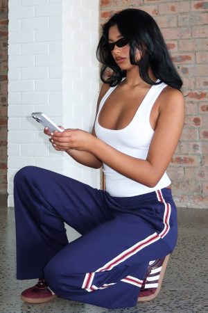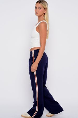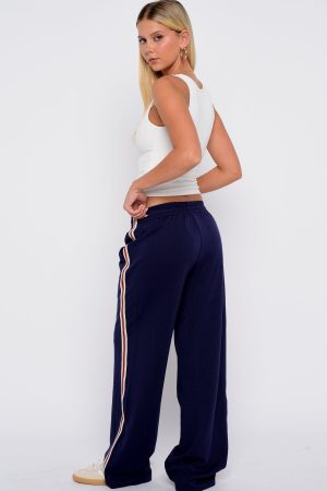 Make travel days cute in the Travel Era Track Pants in Navy! Crafted for ease and elevated style. these trousers feature a thick elasticated waistband. side pockets. and a wide‑leg silhouette. A contrasting stripe down each side adds a sporty. on‑trend twist Pair with a basic tank. sneakers and headband for the ultimate cute girl travel fit!