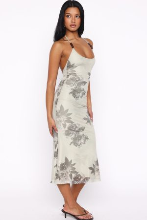 Effortless and chic is she! The Tropic Like It’s Hot Midi Dress in Vintage Muse features self-tie halter straps adorned with beading. a flattering scoop neckline. and a backless design. Lined for comfort. this dress exudes a breezy elegance perfect for sunny days. Pair it with statement kitten heels and layered gold jewellery to add a touch of shine and complete your look.