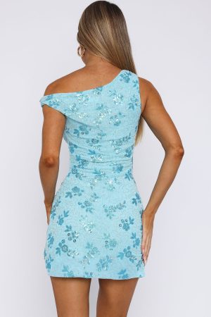 The perfect summer party dress has arrived! The Tropical Twilight Beaded Mini Dress in Baby Blue features a one shoulder neckline. thick straps. figure hugging fit. lined and sequinned/beaded floral design. Complete the look with kitten heels and gold accessories for a look we are obsessed with.