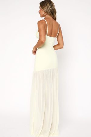 Get ready to stun and steal the spotlight in style! The True Love Maxi Dress Lemon features thin. adjustable shoulder straps. invisible zipper and clasp closure. underwire at bust. front cut out design. sheer. maxi length skirt. high side split and slight stretch material.