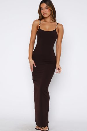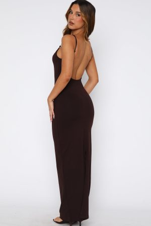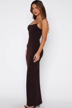 The perfect summer slip dress that does all the talking. fits in all the right places and as comfortable as ever! The Trusting You Maxi Dress in Dark Chocolate features thin. adjustable strap. low back design and unlined. gorgeous fabric. Complete the look with sandals and gold accessories for a look that we love!