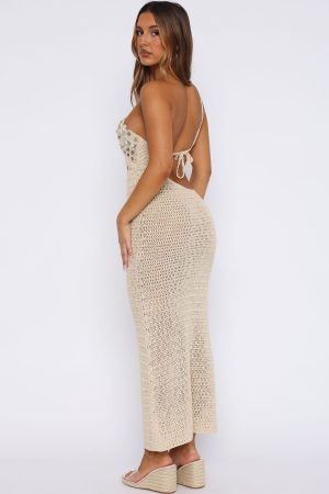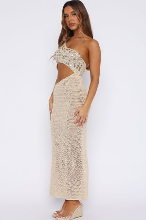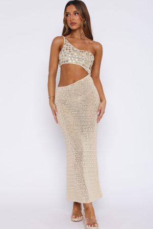 Serve main character energy in our Turritella Treasure Crochet Maxi Dress Shell! Featuring a one shoulder design. centre cut out detailing. backless with adjustable self tie closure. faux shell detailing. and unlined. crotchet material that has slight stretch for an easy slip on design. Complete the look with statement heels and gold jewellery for a look we love.