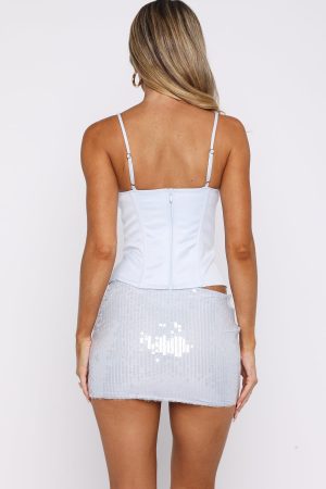 The Twilight Groove Sequin Mini Skirt Ice Blue is made for celebrating! Featuring a thin waistband with invisible side zipper and clasp closure. mini length. lined material . figure hugging fit and paillette sequin detailing for a high shine finish. Pair with the Platform Queen Bustier for a look we can’t get enough of.