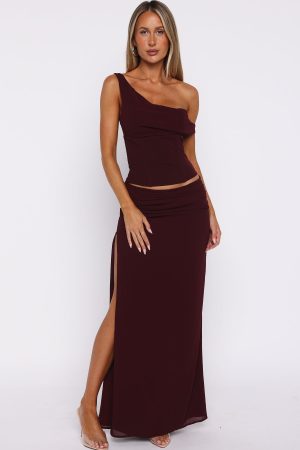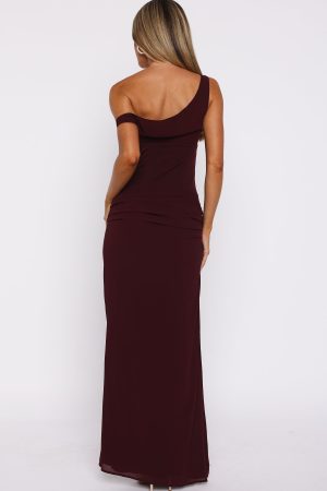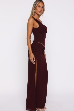 A bold take on feminine elegance. the Unavailable Energy Maxi Dress in Burgundy is designed to captivate. Features a one-shoulder neckline complemented by built-in bust cups and internal boning at waist. A cut-out at the waist adds a touch of allure. while side ruching and a high leg split enhance its sultry appeal. The fully lined silhouette and the invisible side zipper ensures comfort. Pair with your tallest heels and dainty gold jewellery to complete this statement-making fit.