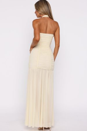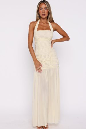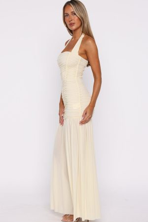 Romantic silhouettes! The Unbothered Always Halter Maxi Dress in Butter features adjustable spaghetti halter straps. a flattering square neckline. and ruched detailing that transitions into a sheer mesh skirt. The high-stretch fabrication and fully lined mini ensures comfort. while the backless design add a touch of allure. Pair with your tallest heels and statement earrings for an unforgettable look.