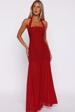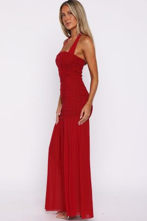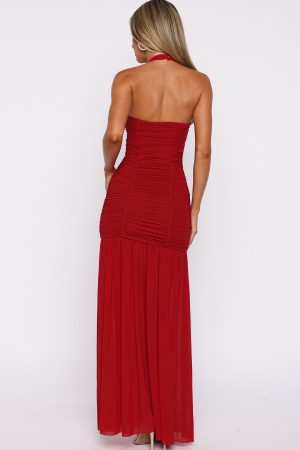 Romantic silhouettes! The Unbothered Always Halter Maxi Dress in Deep Red features adjustable spaghetti halter straps. a flattering square neckline. and ruched detailing that transitions into a sheer mesh skirt. The high-stretch fabrication and fully lined mini ensures comfort. while the backless design add a touch of allure. Pair with your tallest heels and statement earrings for an unforgettable look.