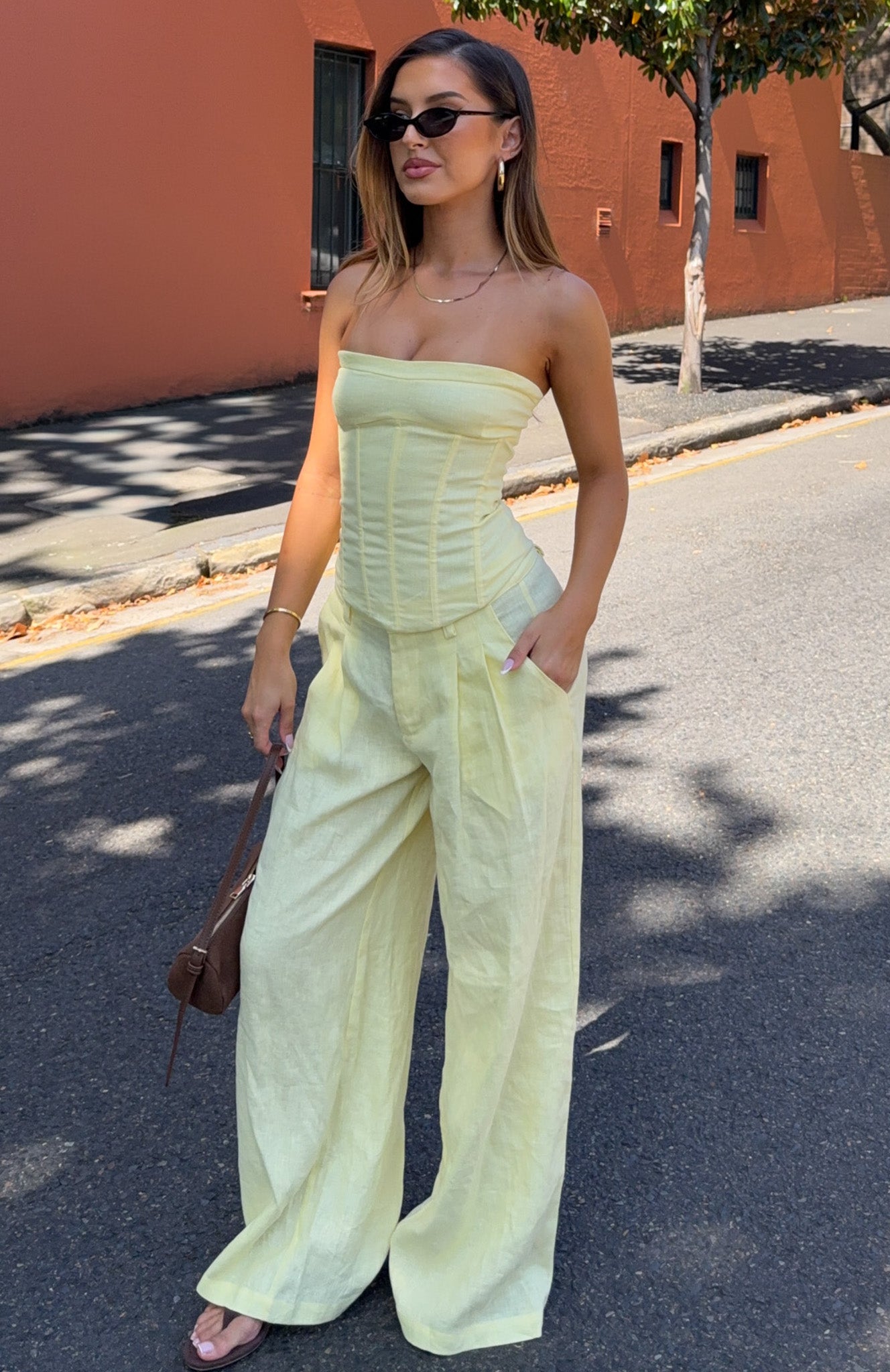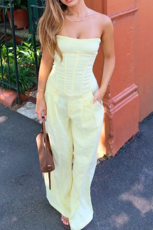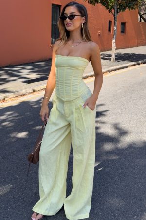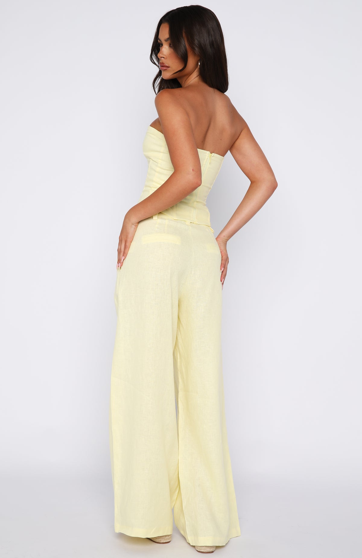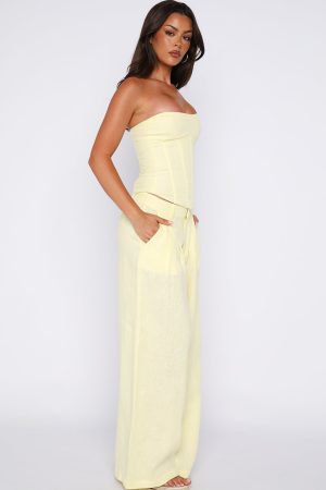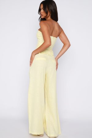 Get summer ready in the Unfinished Feelings Pants White! Features a fixed waistband and double hook‑and‑bar closure teamed with a zipper and button closure. Belt loops frame the waist. while functional side pockets and faux back pockets bring thoughtful detail. The wide‑leg silhouette flows effortlessly. and the unlined fabric offers graceful movement. Style them with the coordinating Downtown Pulse Strapless Bustier and sleek heels for an elevated summery look.