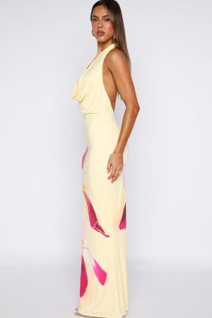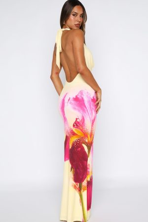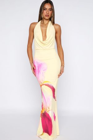 This head-turning dress features a sensual cowl neckline. halter straps that tie at the back. sheer lining. and an elegant backless design. Its floor-grazing maxi length paired with the dreamy printed fabric ensures you’ll shine at any summer soiree. Style with kitten heels and layered gold jewellery to let the dress do all the talking!