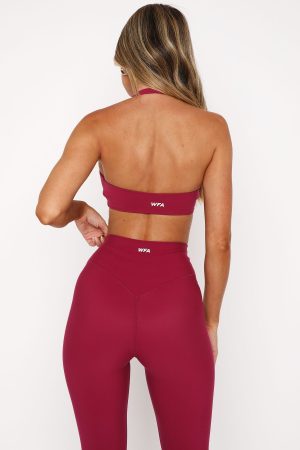 Time to get moving in the Velocity Sports Bra Berry. Features a plunge neckline. thick stretch straps. fitted design. backless design. lined. removable padding and custom patch detail. Pair with one of the matching Keep Up High Waisted Shorts 4 Berry or Go Getter High Waisted Leggings Berry for a look we are loving!