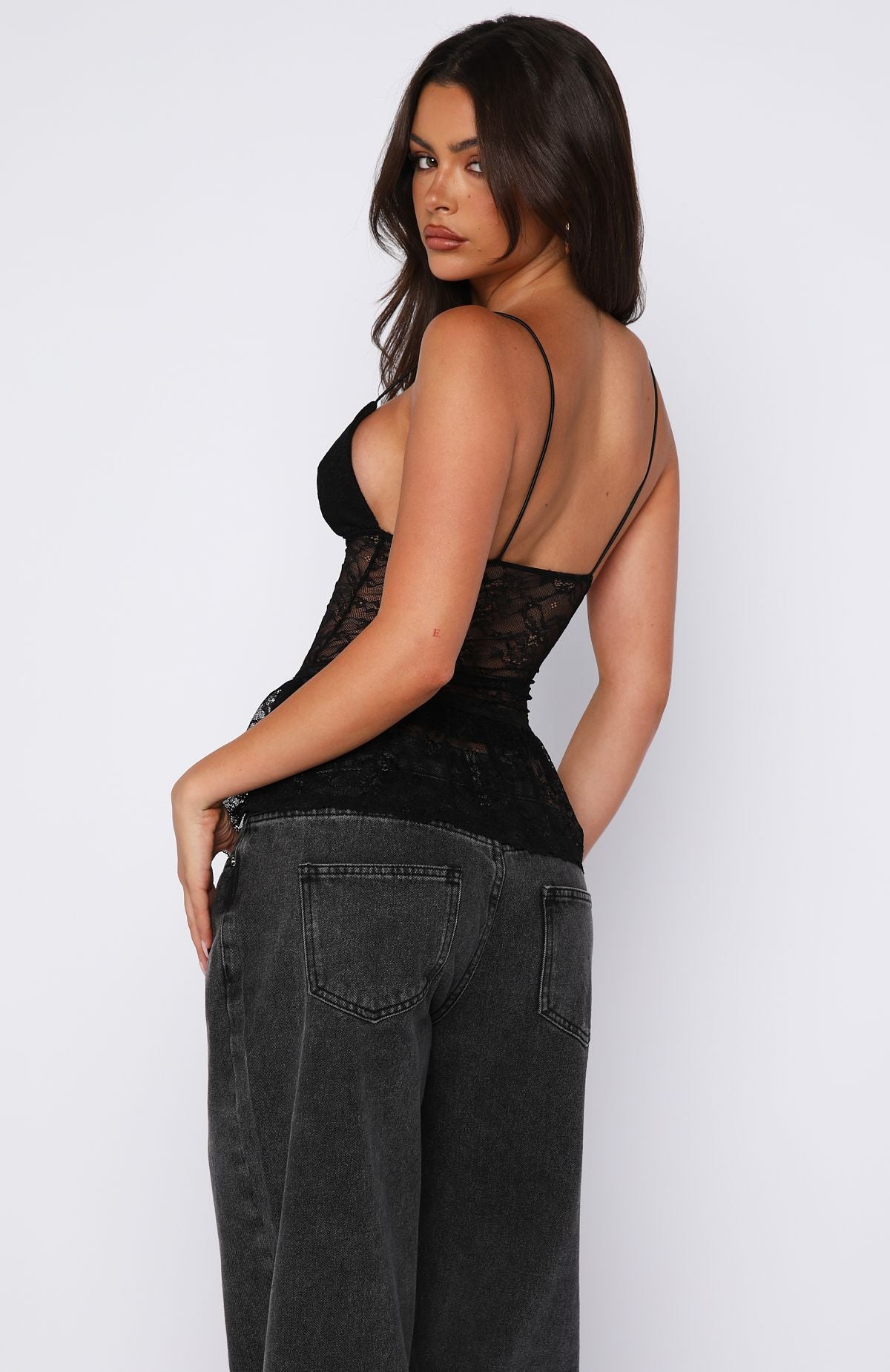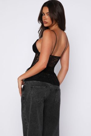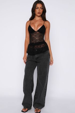 The Vintage Postcard Lace Top Black is designed to bring effortless after-dark energy to any look. Featuring a plunge V neckline with delicate spaghetti straps. this fitted style is crafted from sheer floral lace material at the bodice with a soft. structured bust for subtle support. Finished with a flared peplum hem and adjustable waist tie for a flattering. cinched fit. Style it with low rise denim or tailored pants for an elevated night out moment.