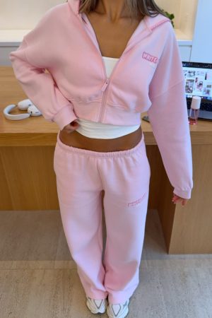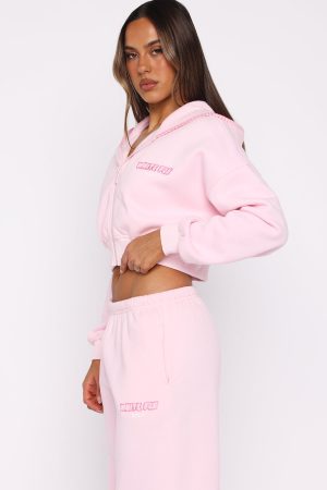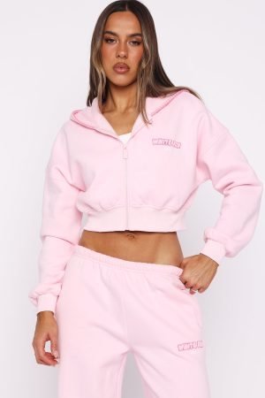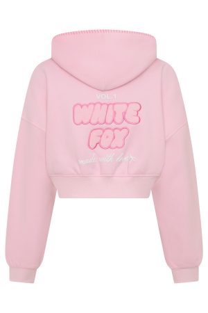 Comfort is an attitude. and this set embodies it. The Vol. 1 Cropped Zip Front Hoodie in Posy features a relaxed hood with exposed stitching. slouched shoulders. cropped length and ribbed hems. which round out a relaxed silhouette. Designed with long sleeves. front zipper closure. and an unlined fleece interior. this hoodie delivers a cosy feel. White Fox woven text embellishes the side front and back. paired with printed made with love text. Pair with the matching Vol. 1 Wide Leg Sweatpants Posy.