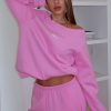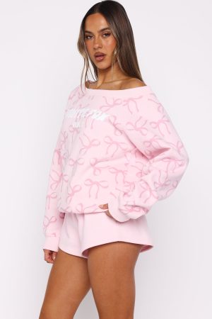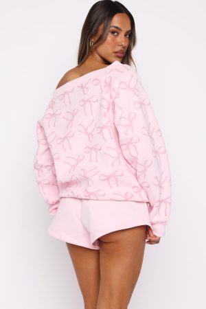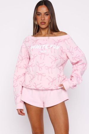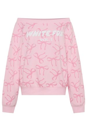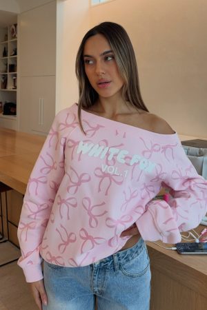 Unwind in style with our prettiest loungewear yet. The Vol. 1 Off Shoulder Printed Sweater in Posy Bow is designed with an off-the-shoulder neckline and ribbed hems. which round out an oversized silhouette. Featuring long sleeves and an unlined fleece interior. this hoodie delivers a cosy feel. White Fox puff print text embellishes the centre front. Style with your go-to denim jeans and colour sneakers for the cutest fit!