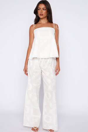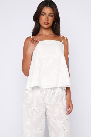 Heat-wave season calls for the Wander Wild Top in White. Features delicate self-tie shoulder straps that knot into chic bows. a flattering square neckline. full lining. and a relaxed. breezy silhouette. Style with the matching Born To Roam Pants for the perfect warm-weather days fit.