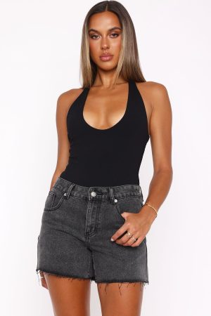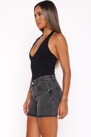 The Want To Be Me Halter Bodysuit Black hugs your body in all the right ways! Features a halter neck design with back self tie strap. an ultra low plunge neckline. backless. stretch material and snap button closure at crotch.