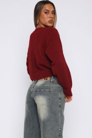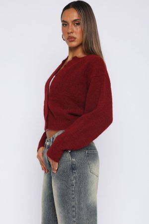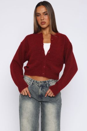 Say hi to your new favourite cardi! The Warm Whispers Knit Cardigan Burgundy features a high neckline. front button closure. cropped fit with ribbing at hemline. drop shoulder and super soft. cosy knit fabric. Looks best paired with a cute boot and White Fox jeans for an instagram worthy fit’!