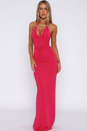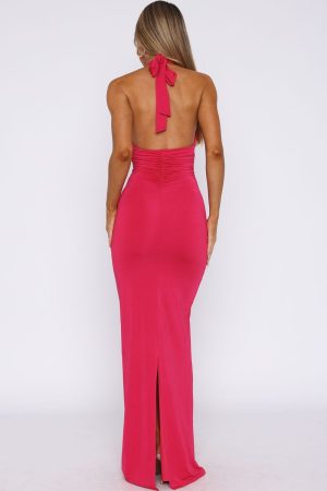 Step into the spotlight in the Waste A Moment Halter Maxi Dress in Hot Pink! features self tie halter straps with gold hardware detailing. v-neckline. backless. ruched detailing lower back. lined and back leg split for ease of walkability. Pair with clear heels. layered gold jewellery and a shoulder bag for a fit we love!