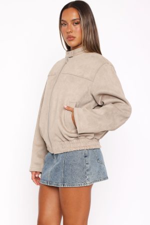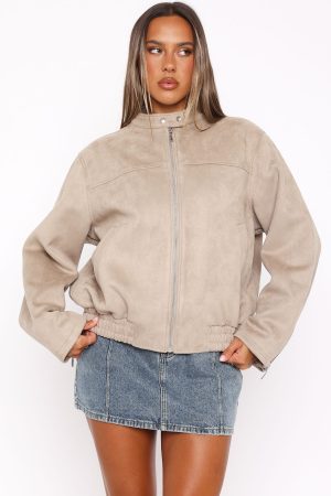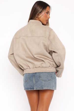 Fight off the chill in the Watchin’ Out Faux Suede Bomber Jacket Sand. Featuring a collard neckline with a button stud closure. centre front zip closure. lined. long sleeves. two front pockets and elasticated hem detailing.