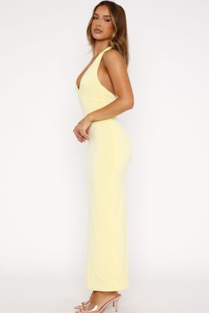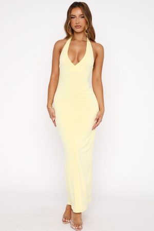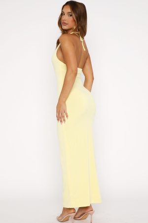 Keep it sleek in the We All Want More Halter Neck Maxi Dress Lemon. Features a halter style neckline with self-tie strap. hugging silhouette. lined fabric. super soft and silky fabrication. maxi length and an easy slip on style. Pair with gold accessories and kitten heels for a super cute fit’!